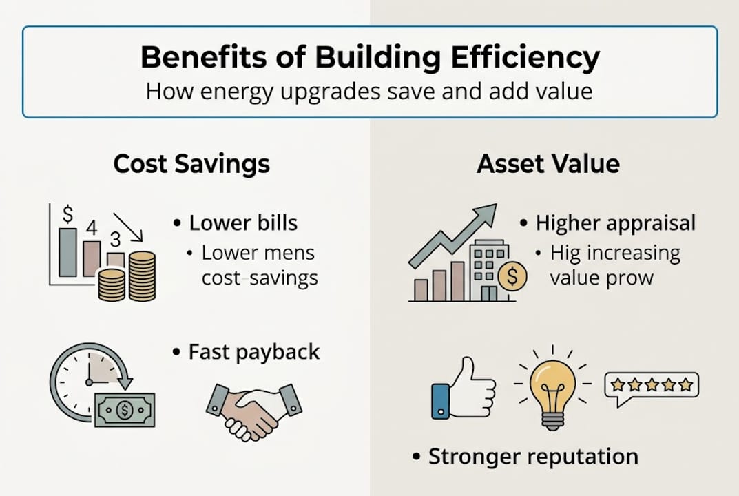 | Market value boost | Efficient commercial buildings command higher asset transaction prices and stronger tenant demand. |