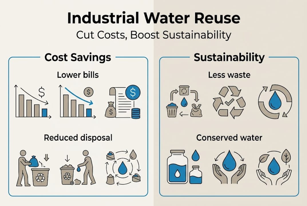 It means treating facility wastewater so it can be reused for processes like cooling, cleaning, or manufacturing, reducing the volume of fresh water drawn from outside sources. This closes the water cycle and cuts both intake and discharge costs simultaneously.