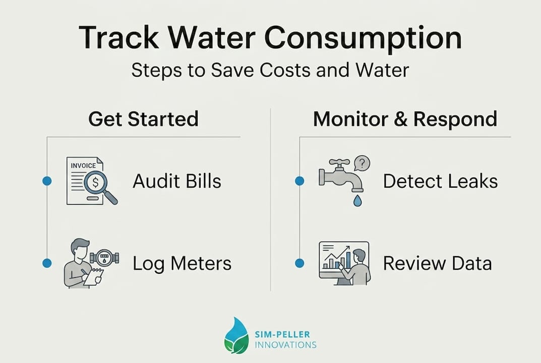 Start with a water baseline audit. Pull utility bills from the past 12 months and log meter readings by week. This gives you a consumption curve that reveals seasonal spikes, unusual patterns, and high-use periods you may not have noticed before. Pair this data with a walkthrough of the facility to identify the primary water-consuming systems: restrooms, cooling towers, irrigation, kitchen operations, and any process water loops.