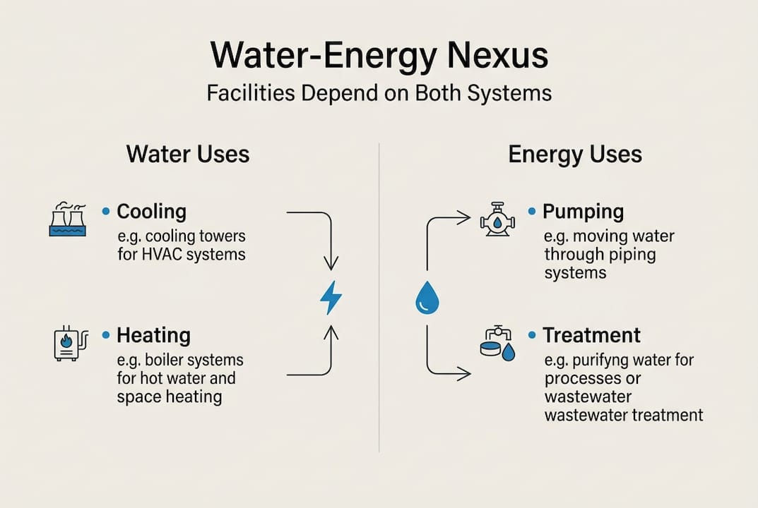 Water and energy are two sides of the same operational coin in commercial facilities, yet most managers still track them in separate silos. Drinking water and wastewater plants account for 30 to 40% of local government energy use, a figure that should stop any facility manager in their tracks. When water costs rise, energy bills follow. When energy prices spike, water operations get more expensive. Understanding this relationship is not optional anymore. This article breaks down the water-energy nexus, shows where it shows up in your facility every day, and gives you the frameworks and tools to act on it.